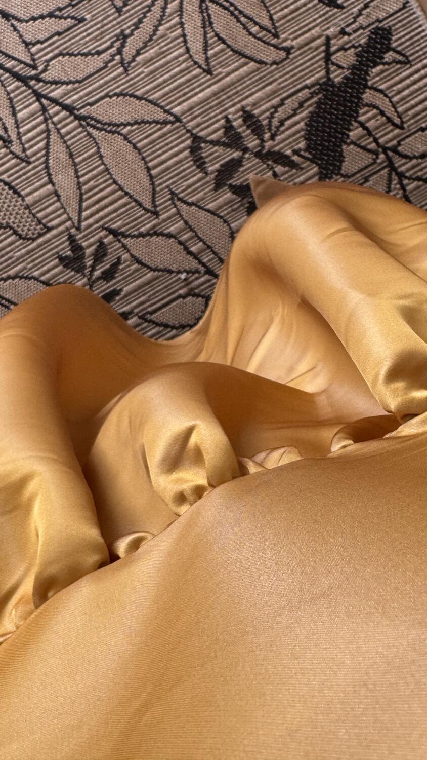 Realizzato in pregiato mikado, si distingue per la sua morbidezza e luminosità che esalta i volumi della linea ampia e fluida.