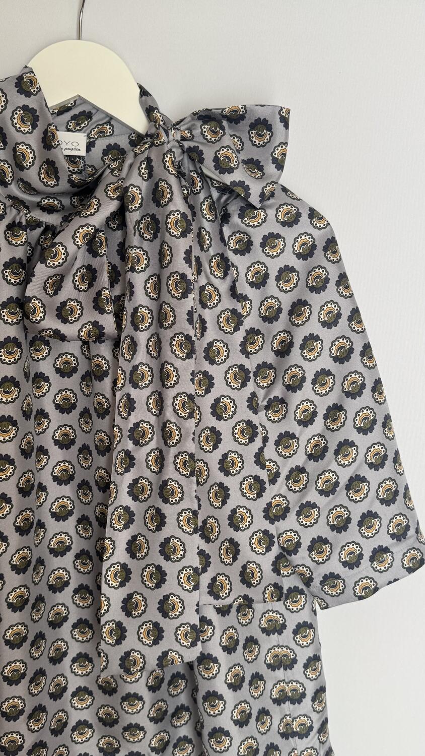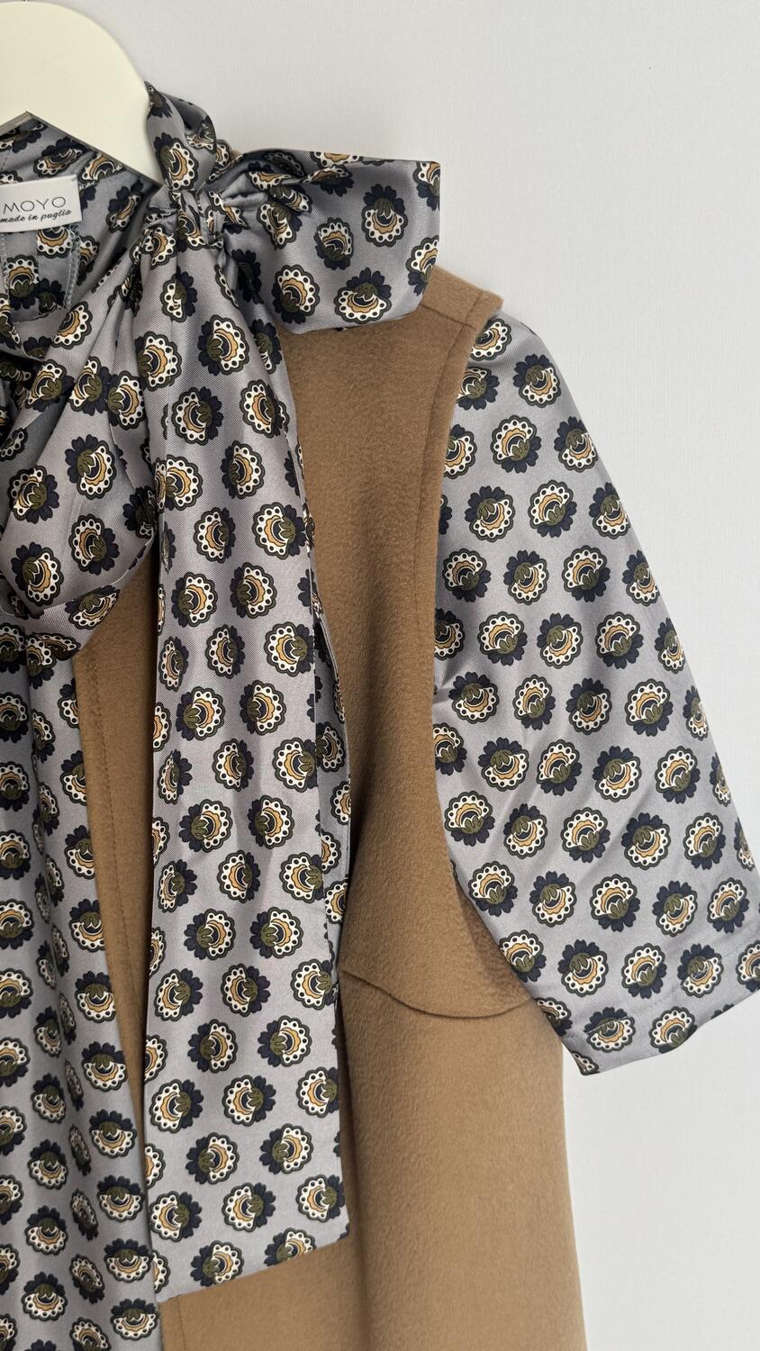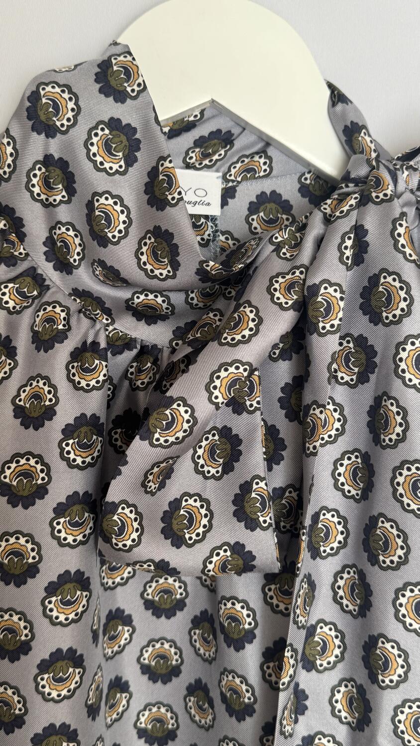 Realizzata in elegante pura seta dalla base grigio azzurra con disegno geometrico, fluida e leggera, scivola delicatamente sul corpo valorizzando la linea femminile con naturalezza.