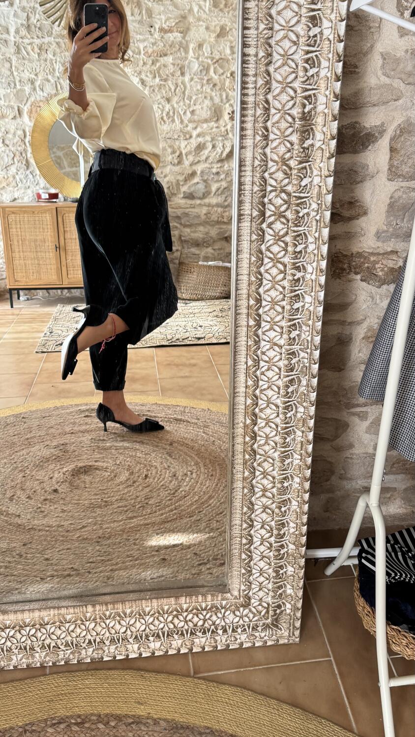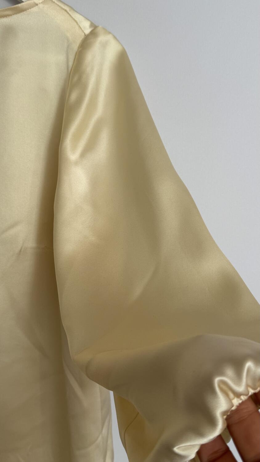 Il design elegante si distingue per lo scollo a V sul retro, profondo 25 cm, chiuso da un maxi fiocco che dona un tocco raffinato e femminile. Le maniche ampie con elastico al polsino, lunghezza tre quarti, creano un delicato effetto di volume, mentre il fondo stondato valorizza la linea morbida e fluida.
