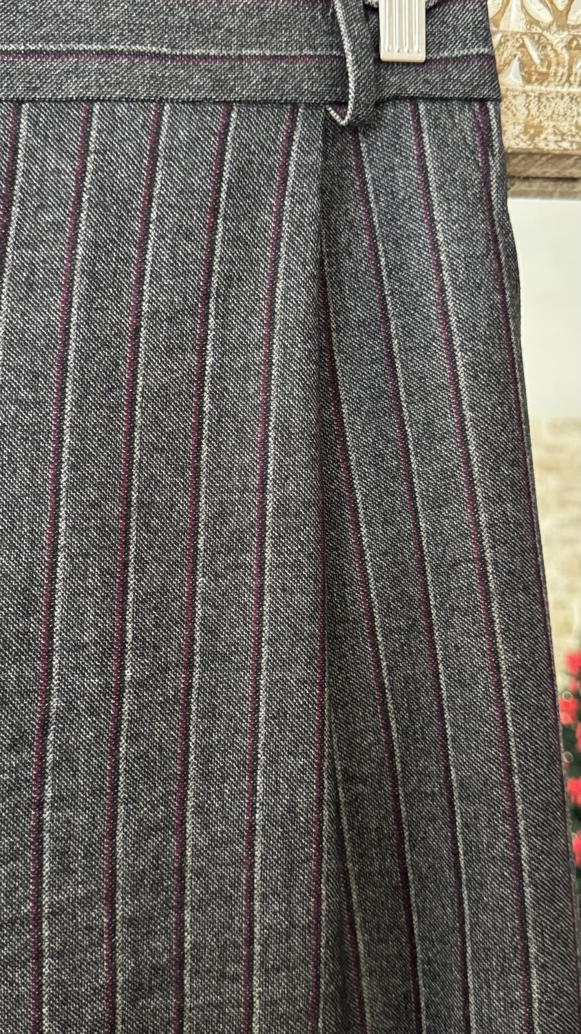 Un gessato moderno, femminile e versatile, perfetto con camicie bianche, maglieria nera o accessori burgundy per un impeccabile richiamo cromatico.