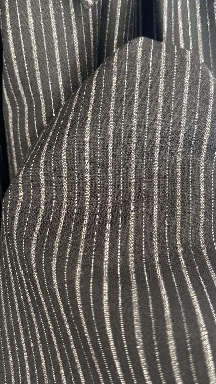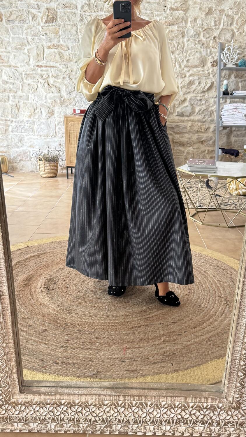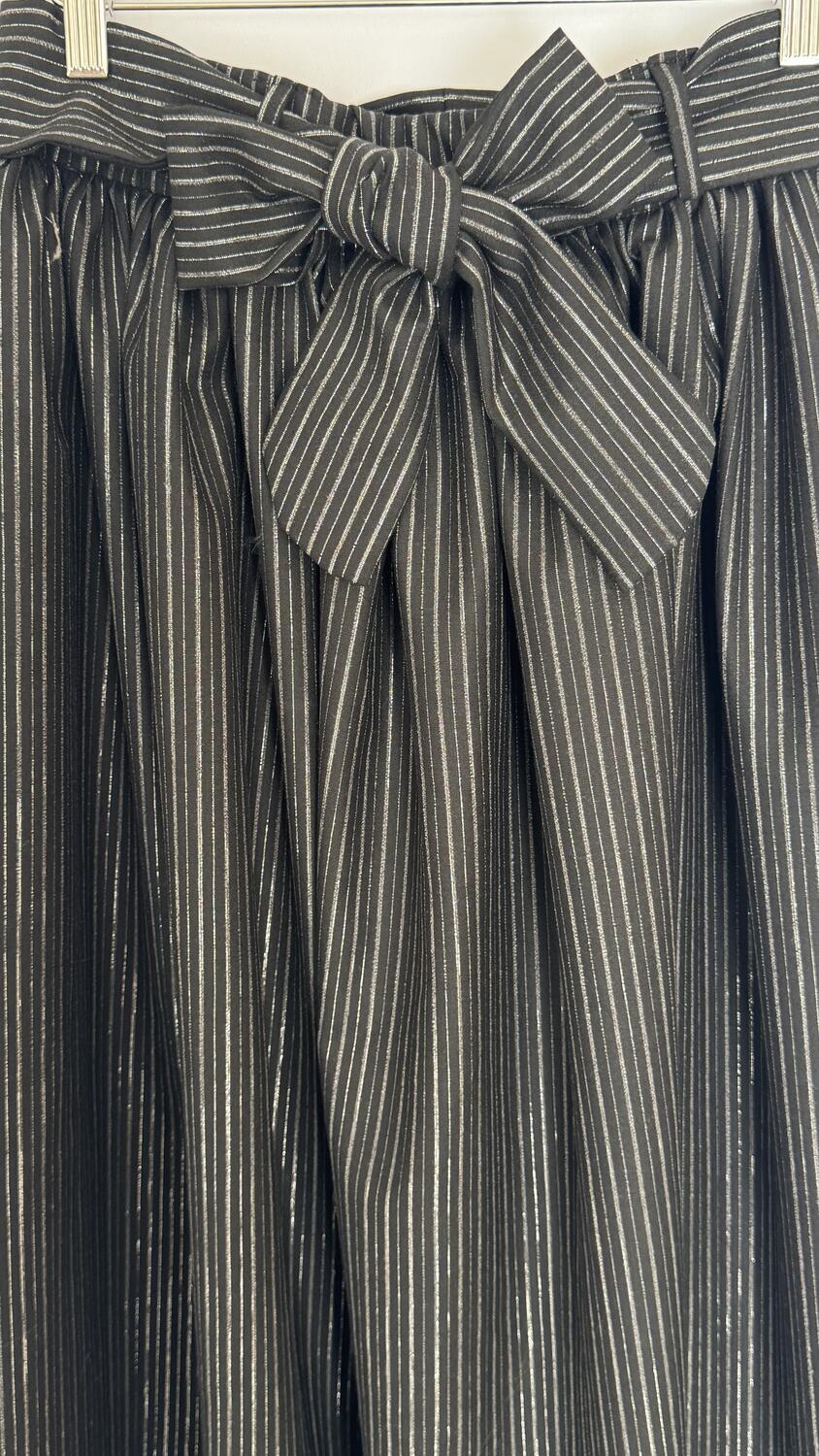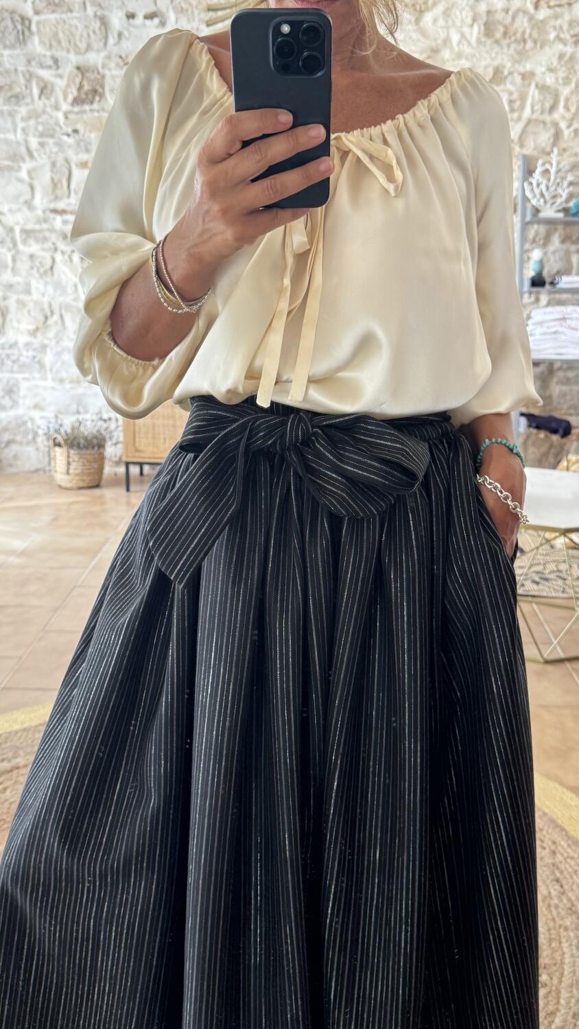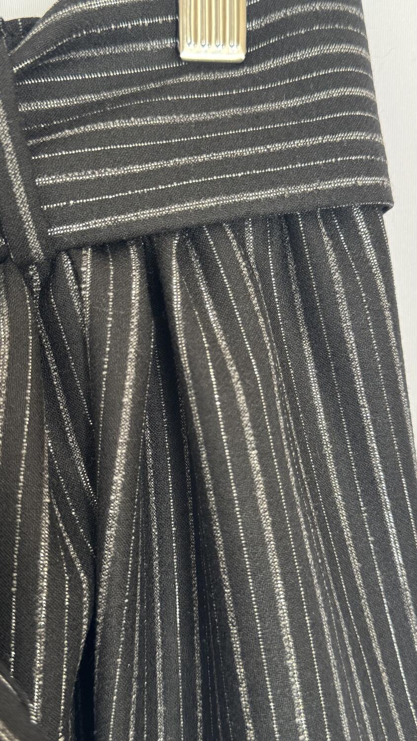 Eleganza senza tempo in questa gonna diritta realizzata in pregiata pura lana con righe verticali in lurex argento su fondo nero.