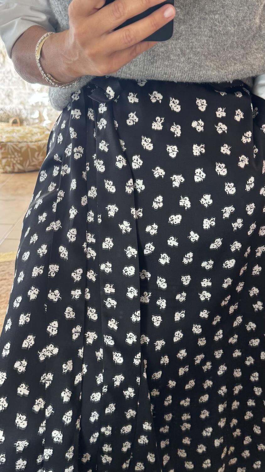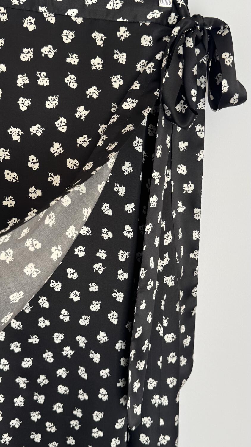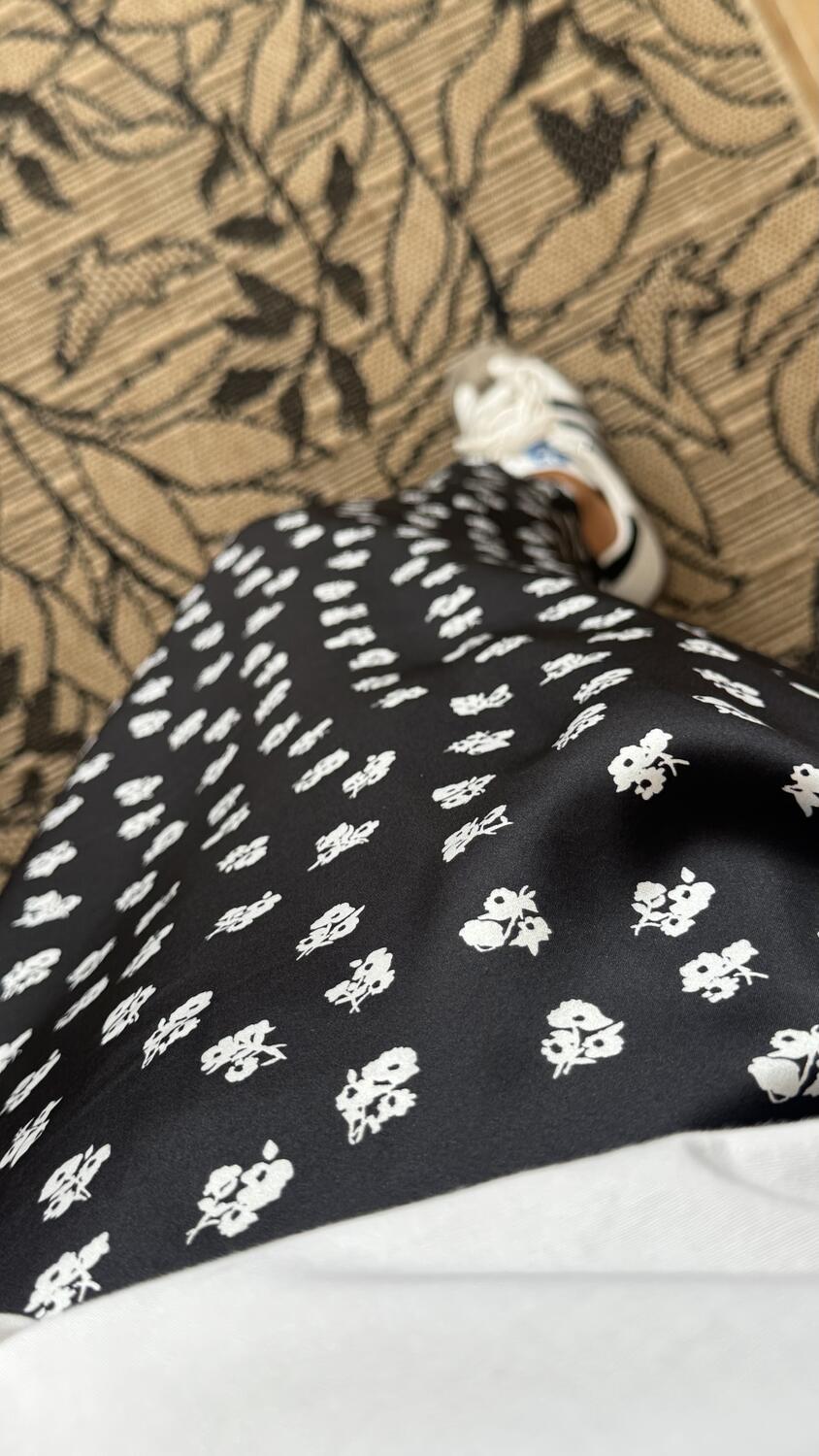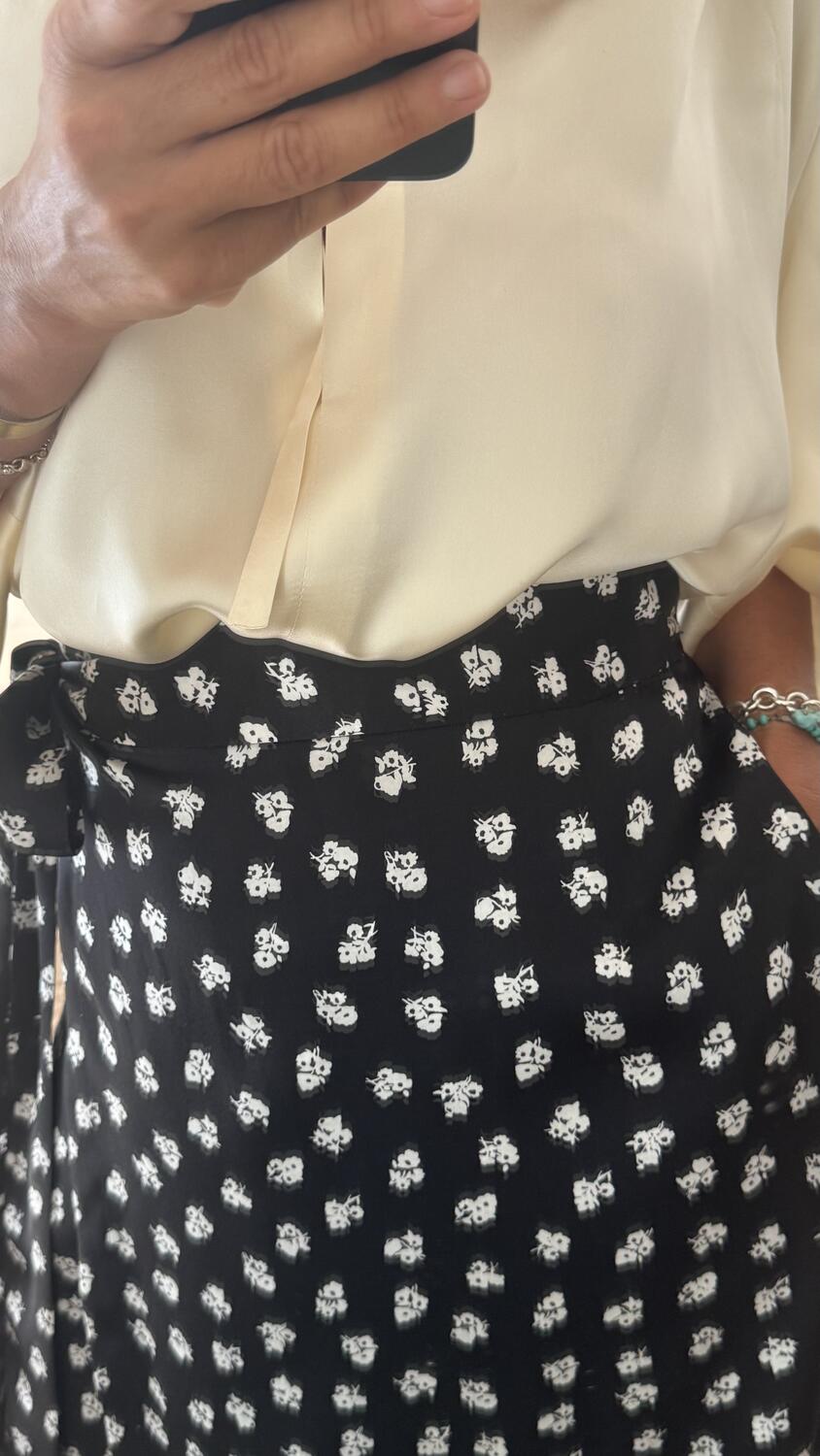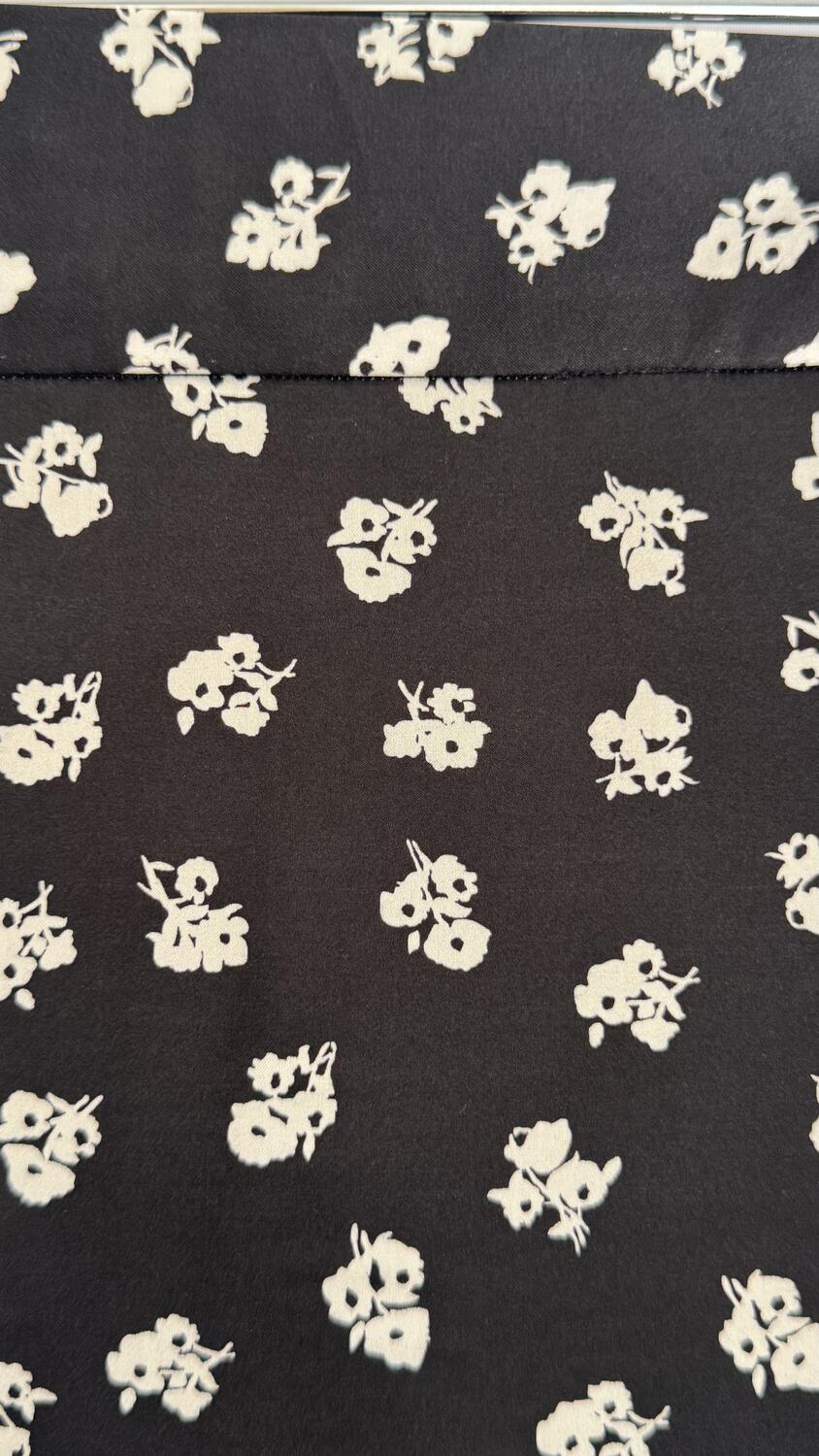 Il tessuto, una seta rasata fluida e luminosa, ha fondo nero con piccoli fiori bianchi che donano un tocco romantico e senza tempo. Un capo versatile, perfetto sia per il giorno che per la sera.