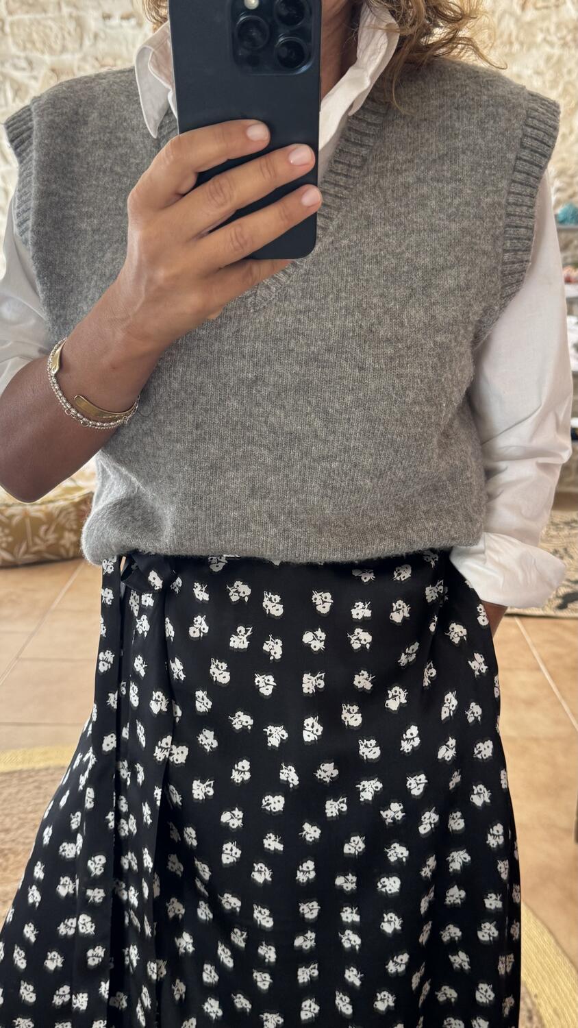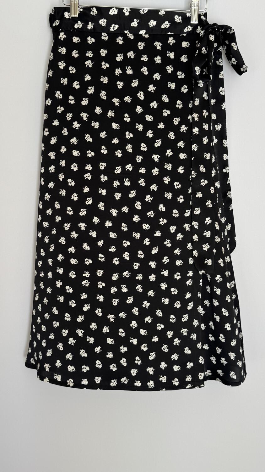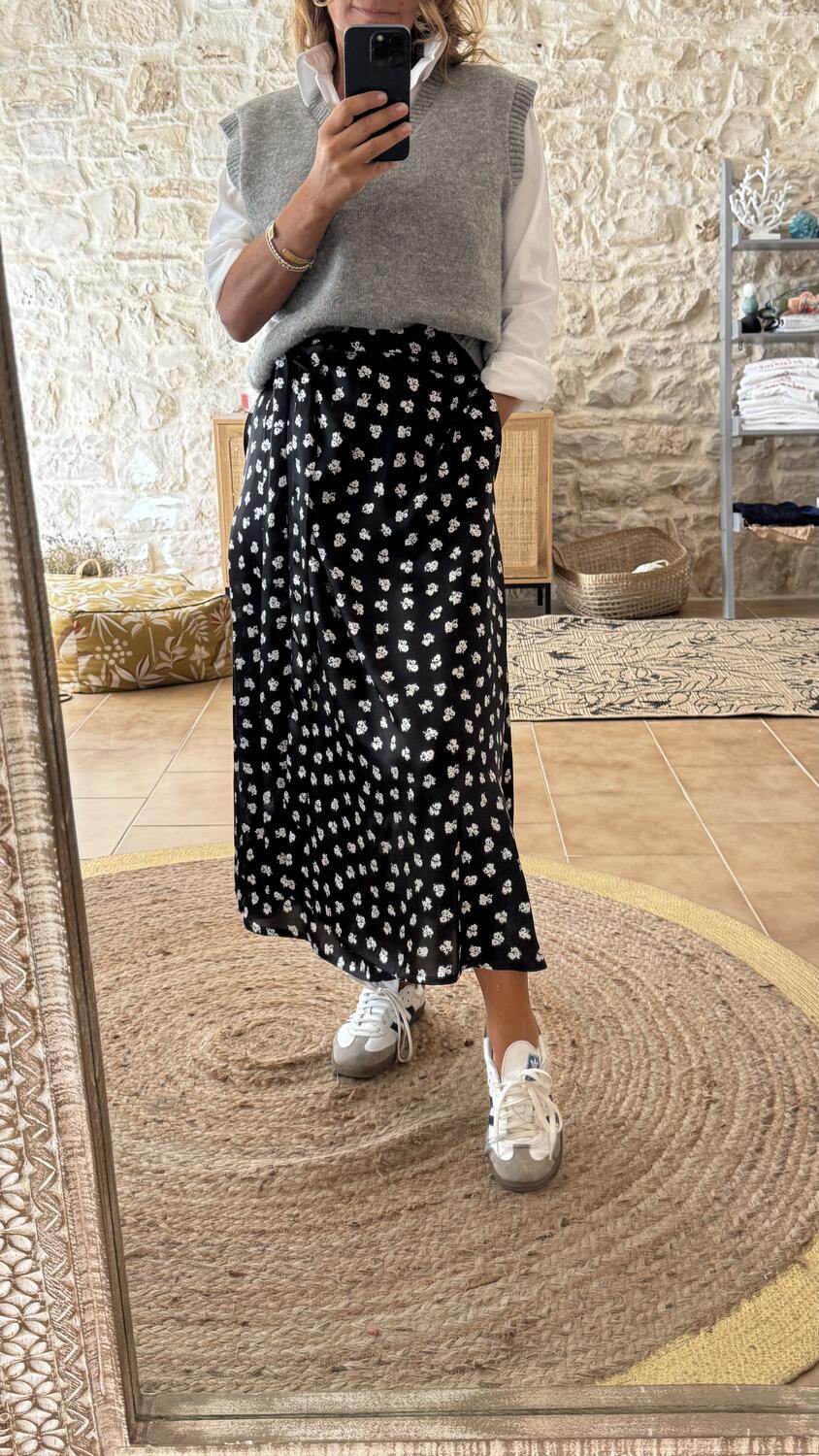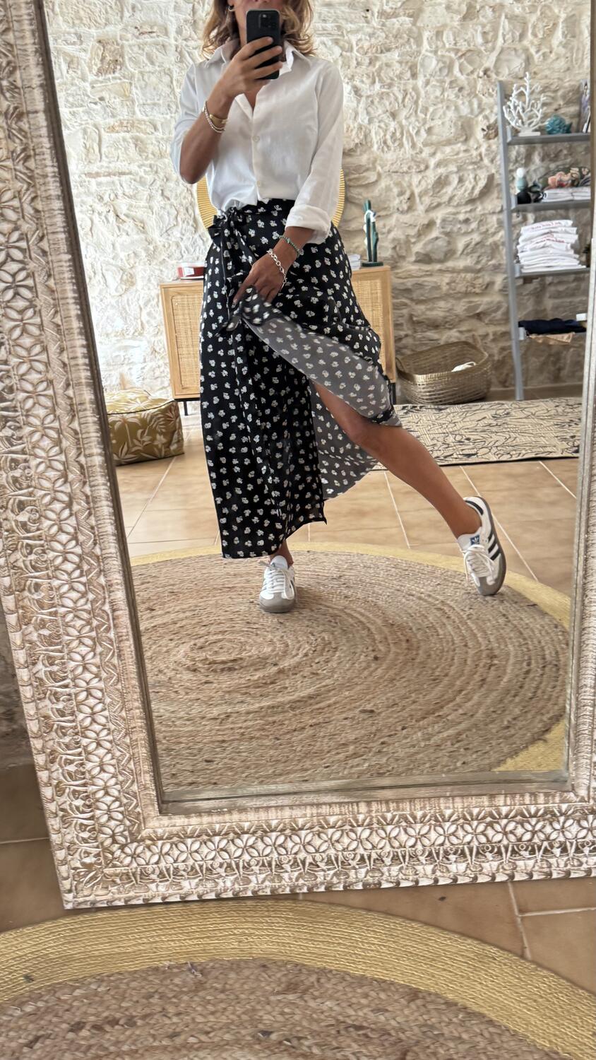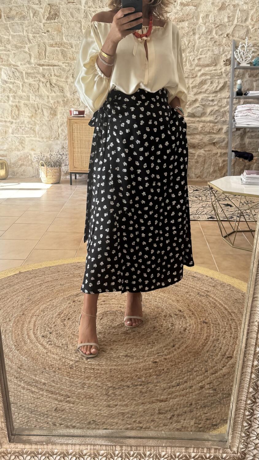 Il tessuto, una seta rasata fluida e luminosa, ha fondo nero con piccoli fiori bianchi che donano un tocco romantico e senza tempo. Un capo versatile, perfetto sia per il giorno che per la sera.