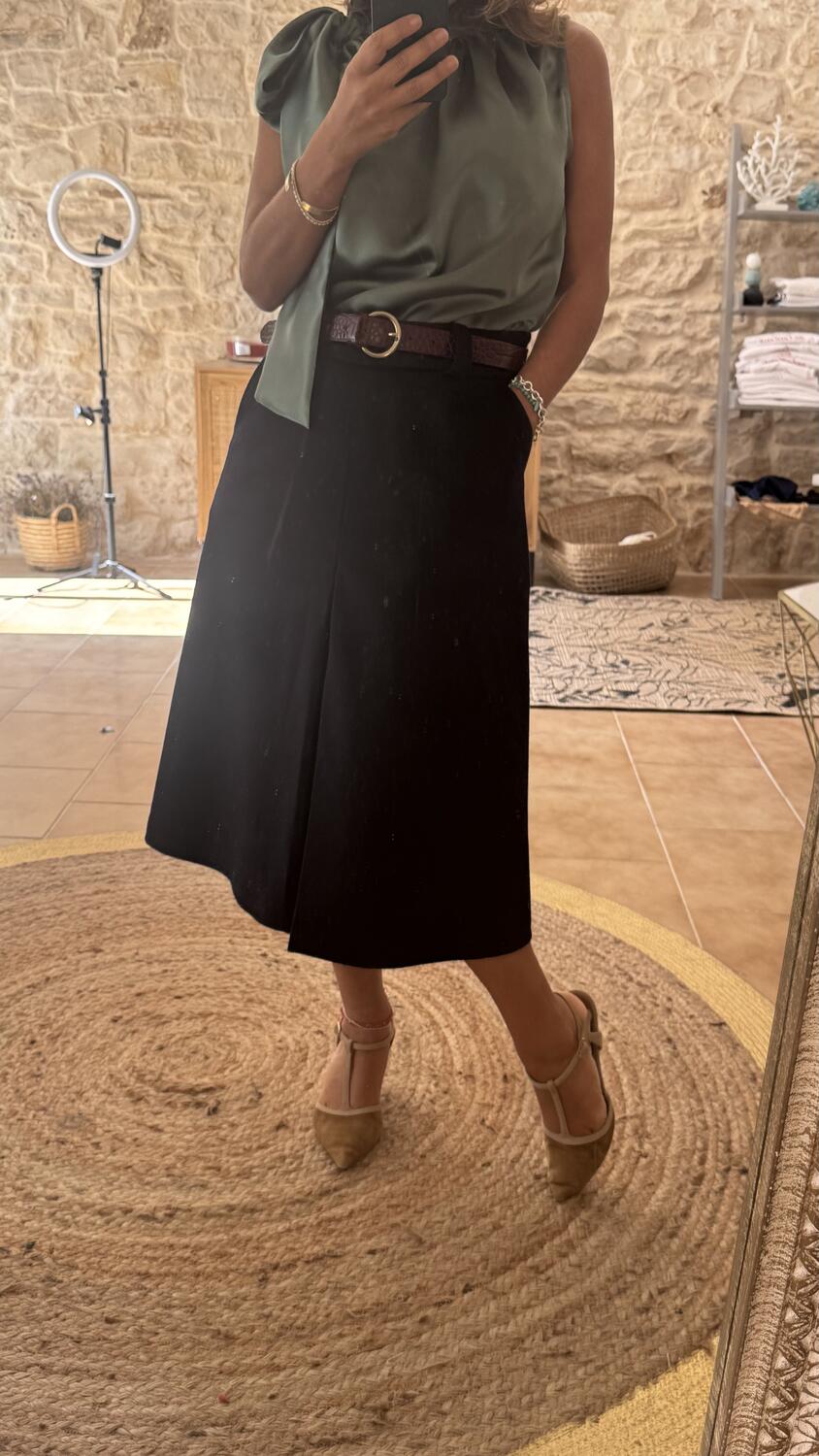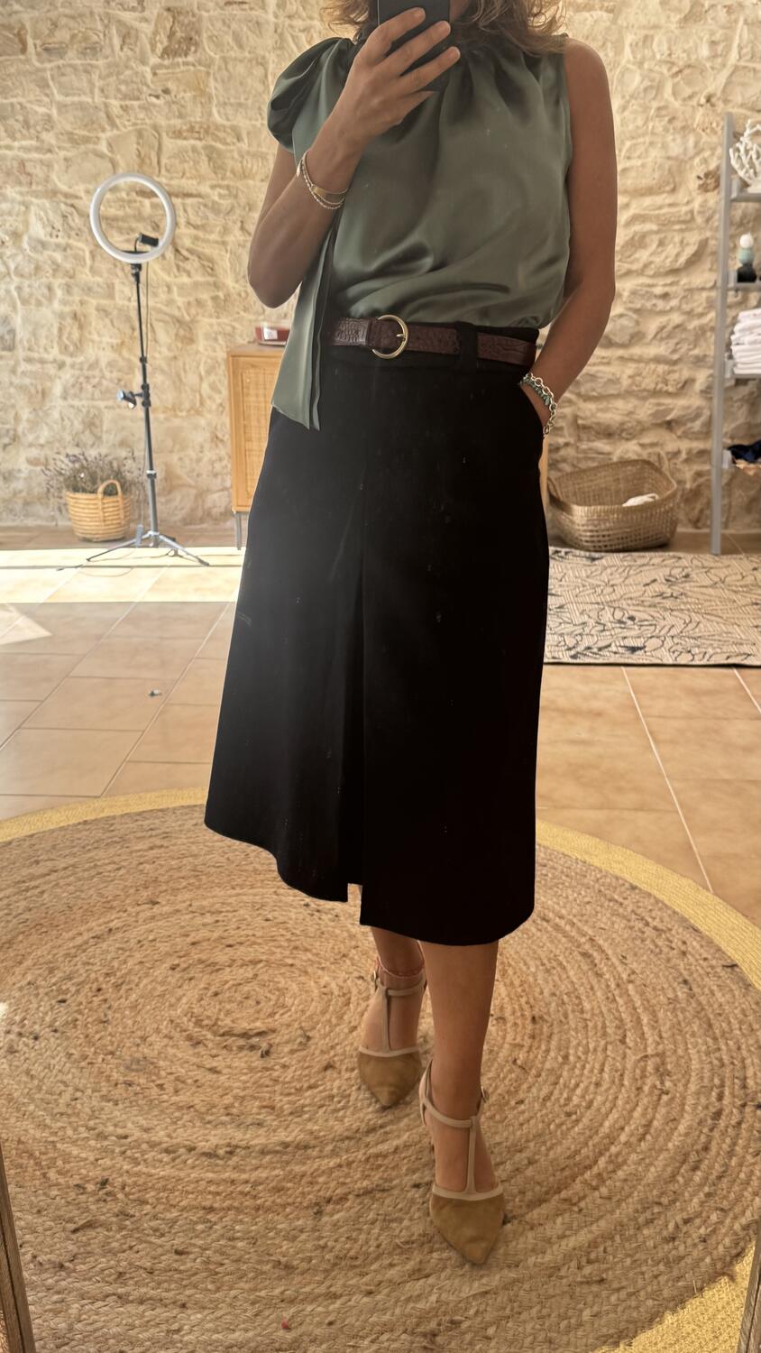 Gonna Timeless in puro cashmere dal taglio sartoriale nel colore blu navy, caratterizzata dalla linea ad A: taglio pulito ed elegante con piega baciata centrale e spacco discreto. Il design è arricchito da passanti in vita e tasche laterali interne, dettagli che uniscono praticità e raffinatezza.