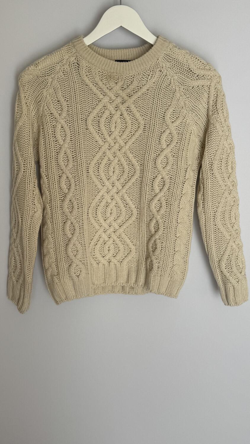 Un modello ispirato ai tradizionali maglioni Aran, reinterpretato in chiave contemporanea con una linea pulita e femminile.